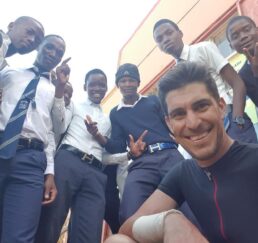 Kurz vor Schluss der Etappe, ich tanke Wasser in einem kleinen Dorf, ca 100 Schüler stehen vor dem Laden.