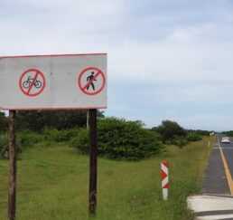 Plötzlich sehe ich eine Tafel (ich befinde mich in einem Wildlifereservat, hoffe die Löwen sind noch nicht wach, ich frage einen Autofahrer ob es gefährlich ist?