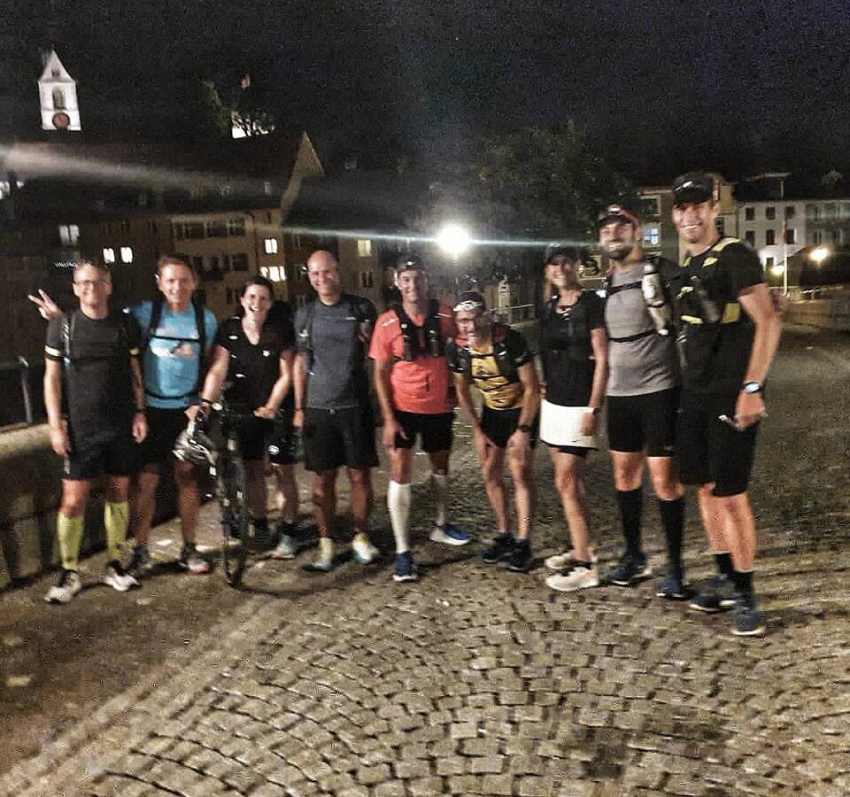 23.45Uhr 8 Läufer/inn und eine Radfahrerin stehen im Zentrum des historischen Städtchens von Laufenburg.