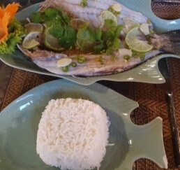 Nach einem Bad im Meer stand das Nachtessen auf meinem Programm. Fisch mit Reis. Auf der Karte stand, Schärfe 3/5. Ich fragte wie scharf dass sei, die Kellnerin lachte nur. Ok, ich frage anderst, scharf für mich oder scharf für dich. Sie sagte, scharf für mich. Ich habs bestellt